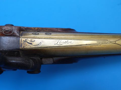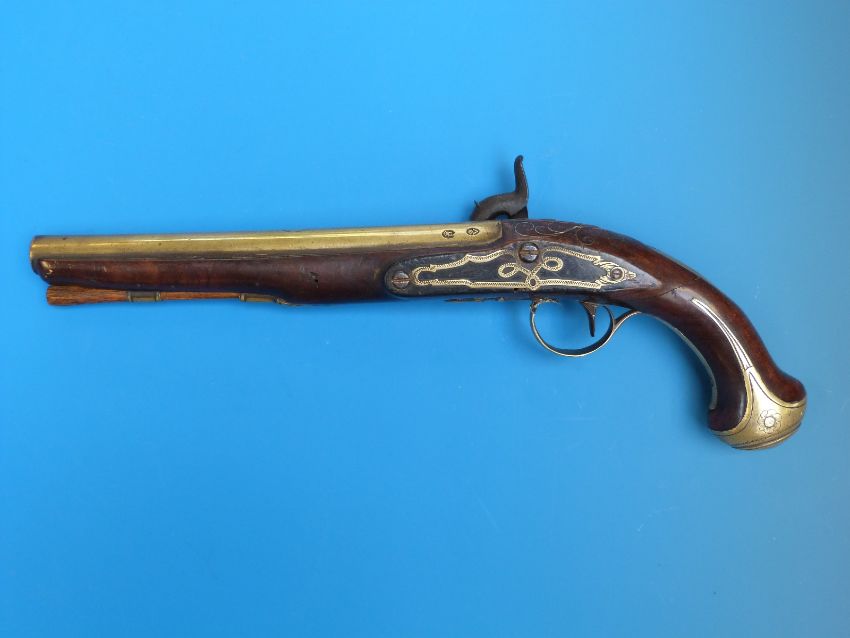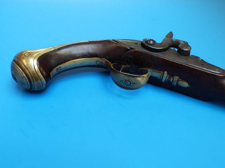 A Parkes of London percussion holster pistol with engraved brass barrel and mounts, acorn finial, trigger guard and P and V proof marks.