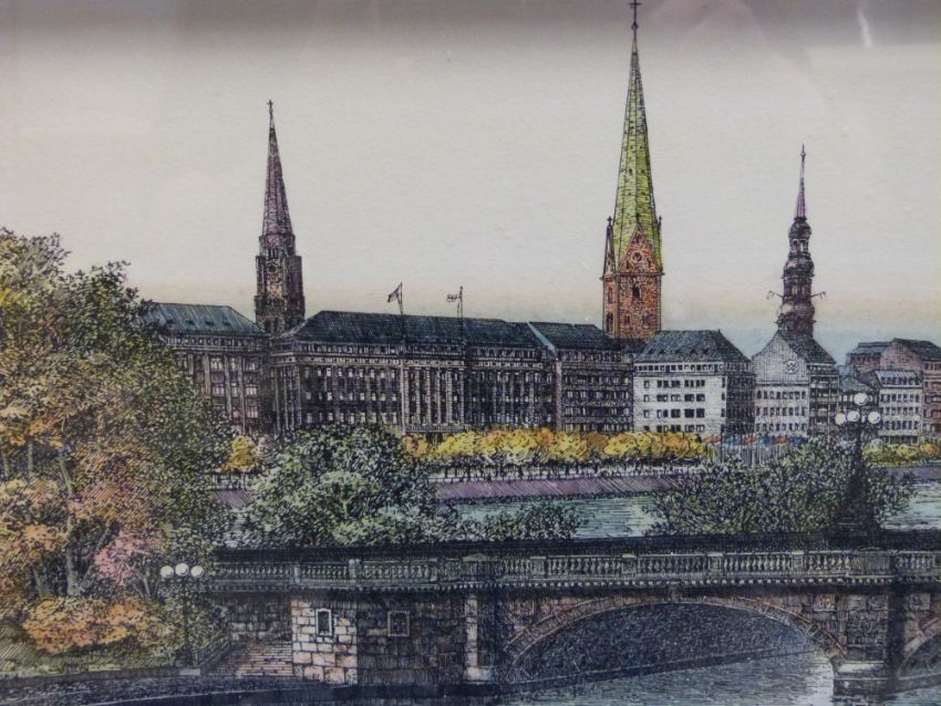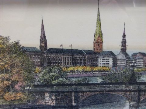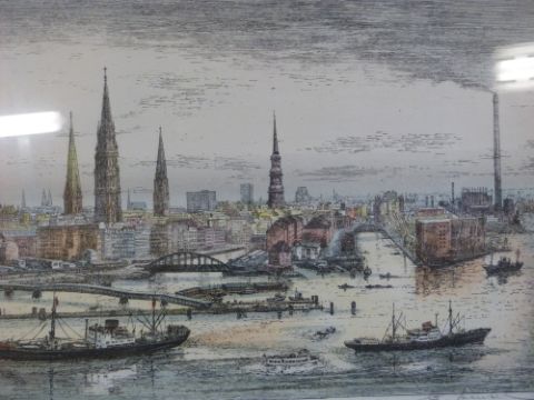 A pair of waterfront city scene coloured engravings signed Menzel (28cm x 90cm)