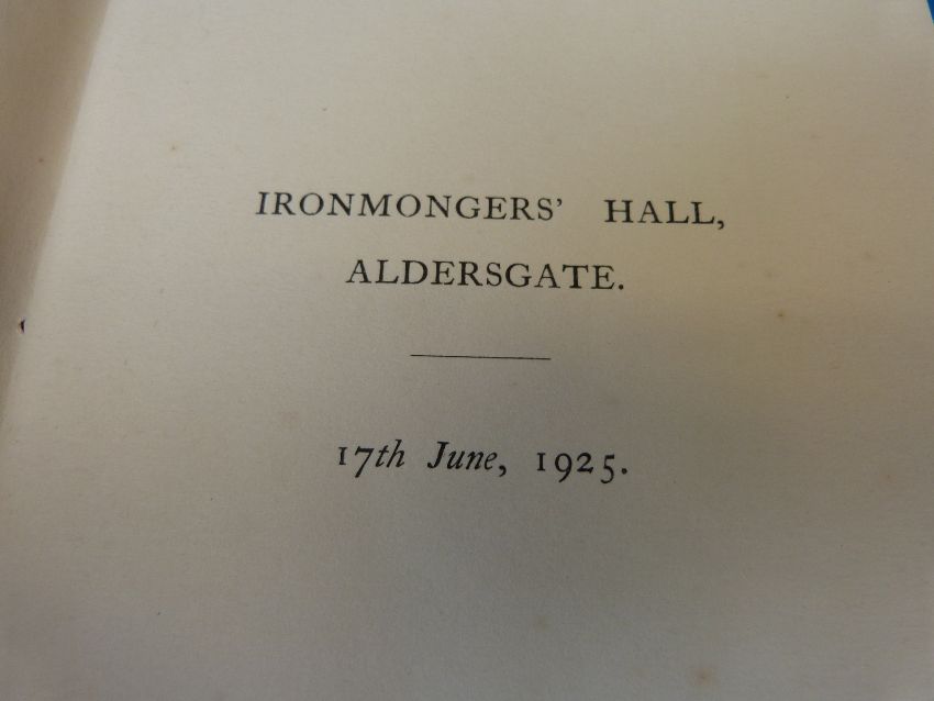 Four transfer printed plates with Minton impressed stamp and marked Gardiner to base, decorated with the crest of The Worshipful Company of Ironmongers together with ephemera relating to the Ironmongers Hall and a signed copy 'A Brief Description of the New Ironmongers Hall' by Sydney Tatchell (architect)