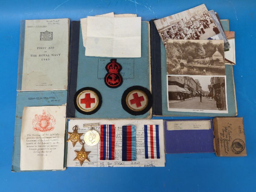Three WW2 medals and ribbons awarded to Mr R G Coates, his certificate of service, various Royal Navy booklets and related paperwork and badges together with a small quantity of postcards of local interest