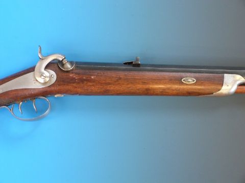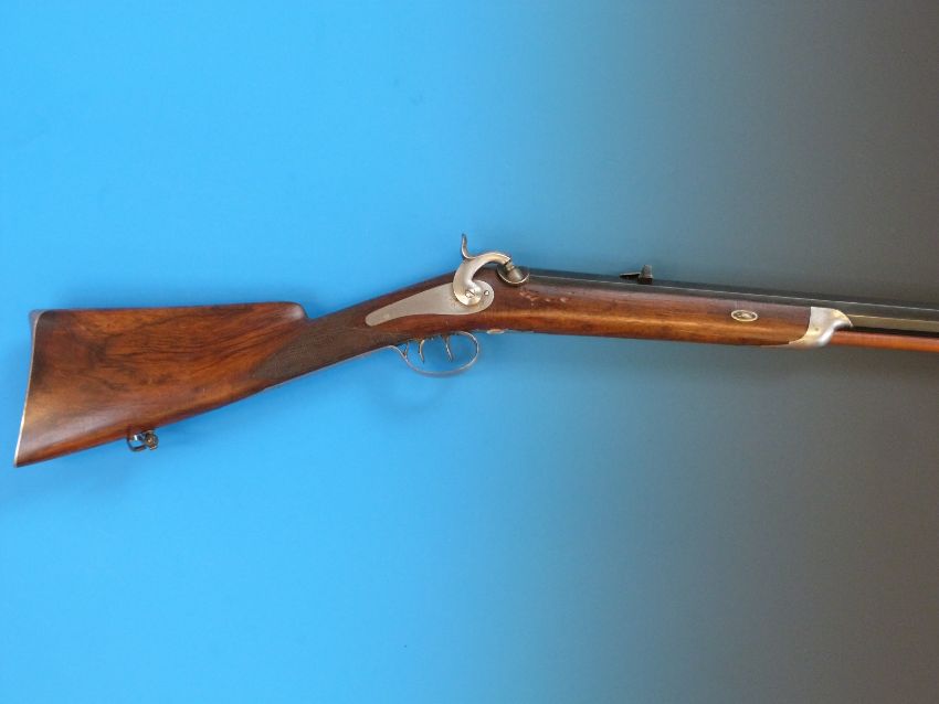 A 20 bore single barrel percussion target rifle with adjustable trigger, octagonal barrel chequered grip and ram rod, circa 1850.