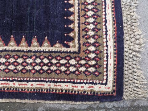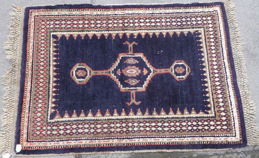 A handmade rug with three central diamond guls, multiple geometric borders set against a predominately red ground (230 x 125cm)