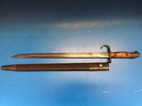 A late 19thC Mk III bayonet with plain unfullered blade, ministry mark to blade VR 2/94, in scabbard, 46.2cm length, together with a further example