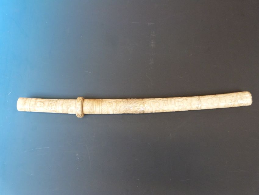A 19thC Japanese Tano dagger, the 28cm single edge steel blade with one-piece brass habaki, the bone grip and scabbard covered and stained with scribes