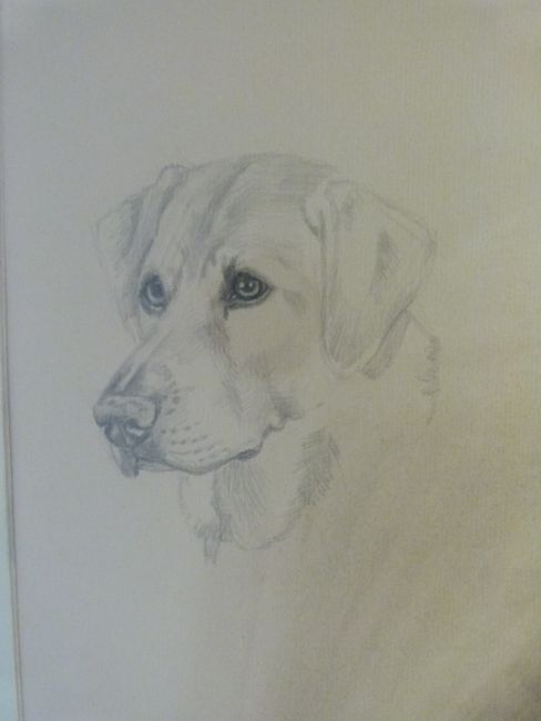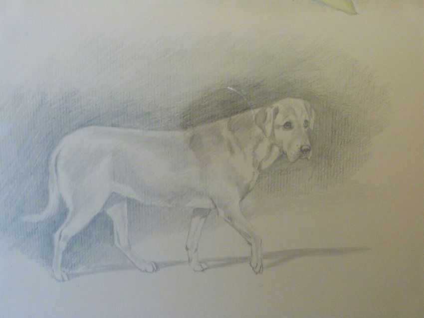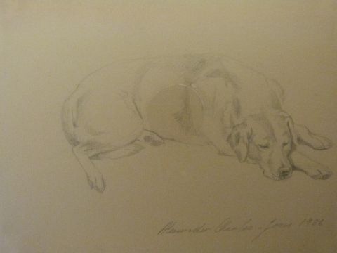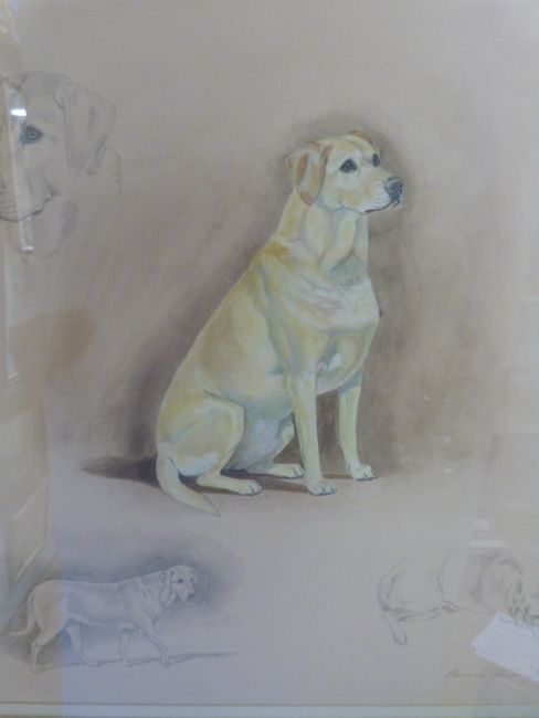 Alexander Charles Jones watercolour of golden Labrador dog with pencil vignettes, signed (47 x 44cm)
