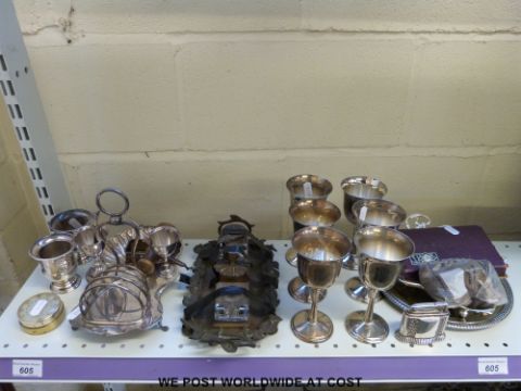 A plated egg cruet and toast rack, brass ink well, goblets, corkscrew etc
