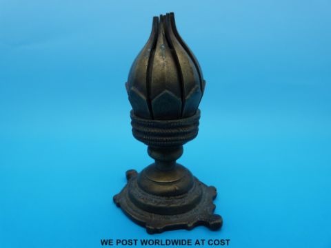 A 19th/20thC brass receptacle opening to reveal a flower shape with central bowl, probably Tibetan (12cm tall)
