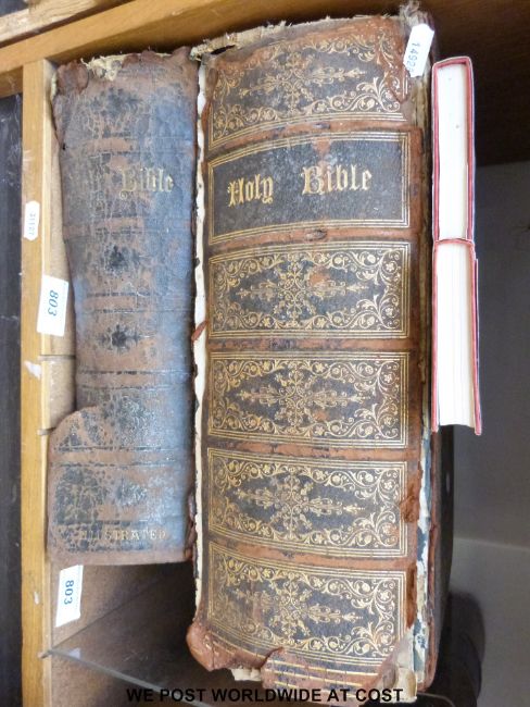 Two Victorian leather-bound Bibles, both illustrated, one in colour with birds of the Bible, plants etc together with two Observers books on Churches (one a first edition)