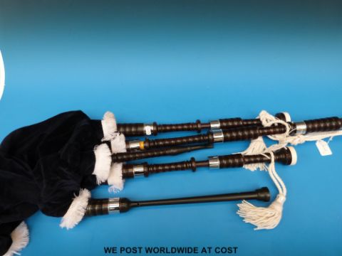A cased set of rosewood bagpipes by Kilberry, Edinburgh with synthetic Bannatyne bag and blue "velvet" cover, in carry case.
