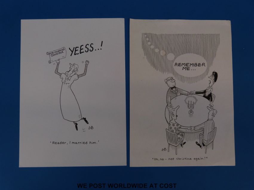 Neil Bennett two original pen & ink cartoons. A woman holding a pre-nuptial contract shouting Yeess! Headed "Reader, I married him" from Charlotte Bronte Jane Eyre. The second bearing reference to Christina Rossetti. Both initialled.