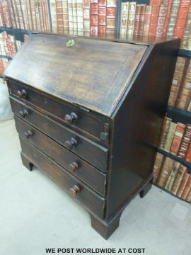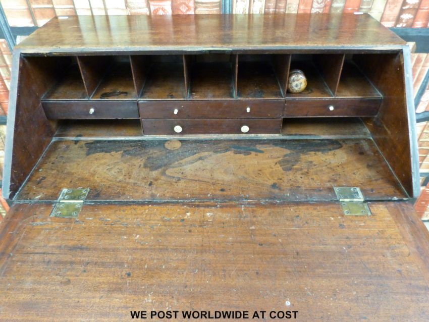 A mahogany bureau with four drawers, opening to reveal nine compartments and four drawers with turned ivory knobs, raised on bracket feet (91cm x 103cm x 53cm)