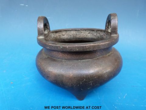 An 18thC/19thC Chinese bronze censer with loop handles and engraved decoration raised on three short feet, seal mark to base (13cm diameter)