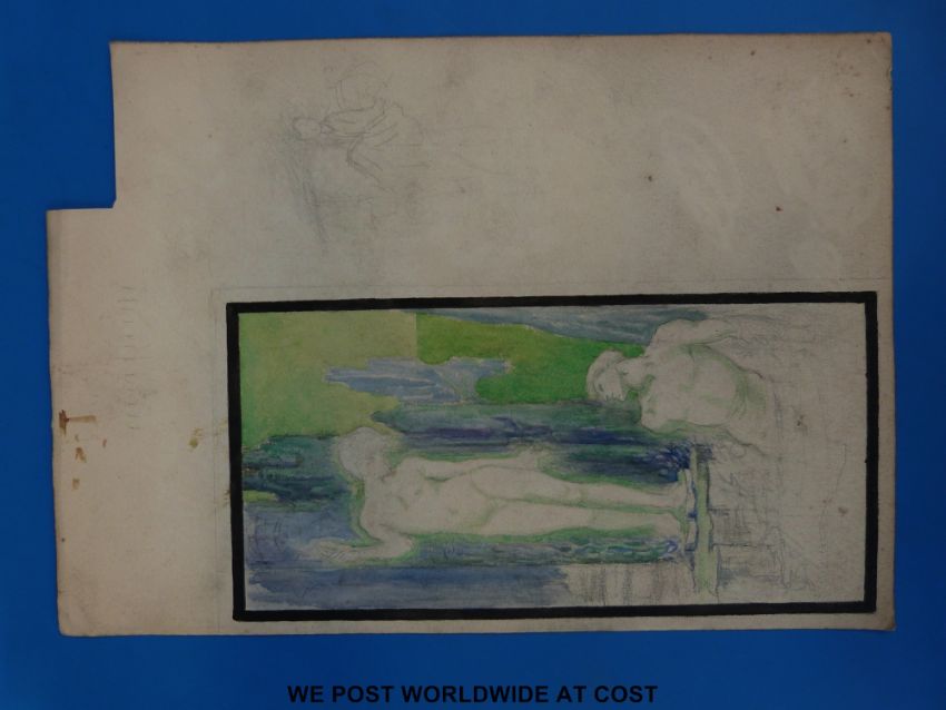 W. Graham Robertson (1866-1948) Original watercolour & pencil illustration depicting two naked male figures, one partly submerged. Small pencil sketch of child in margin. 28 x 14cm on large sheet