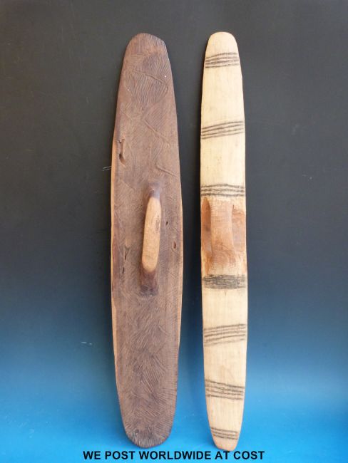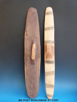 A carved Aboriginal wooden shield with geometric line carved decoration together with another light wood example, items were in wrapping from Cunderlee Mission Western Australia (both 72cm long)