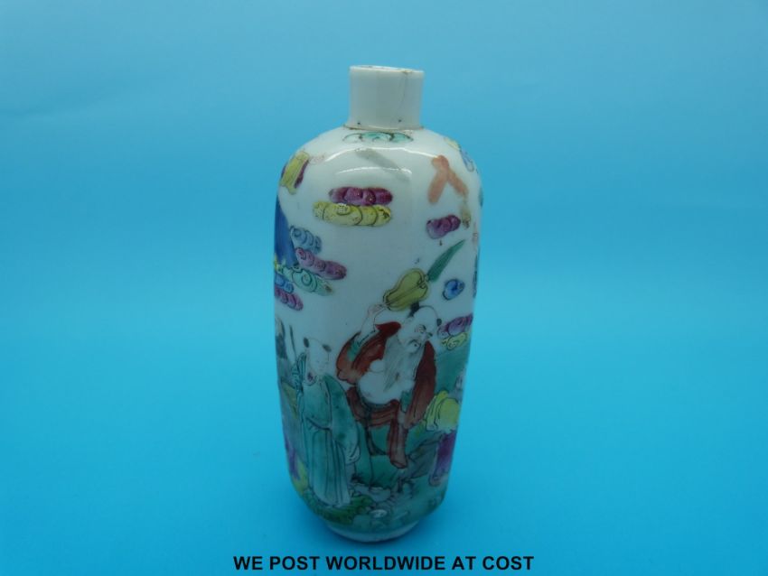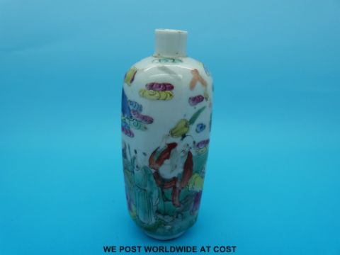 An unusual 19thC Chinese perfume bottle decorated with various immortals (12cm tall)