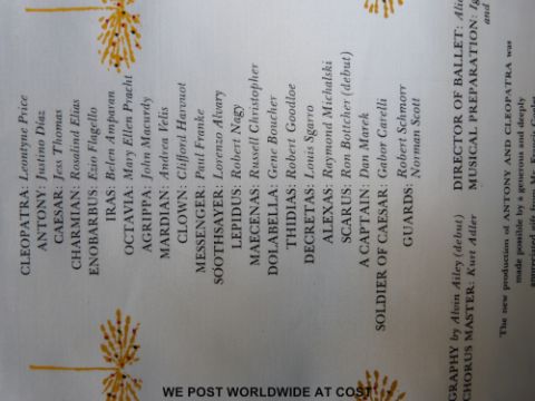 Metropolitan Opera House silk programme for concert at the Met on 16th September 1966. The world premiere of Samuel Barber's 'Antony & Cleopatra' from William Shakespeare, designed & staged by Franco Zeffirelli. Printed in black, red & yellow with fringe surround, in gold paper tube (50 x 26cm)