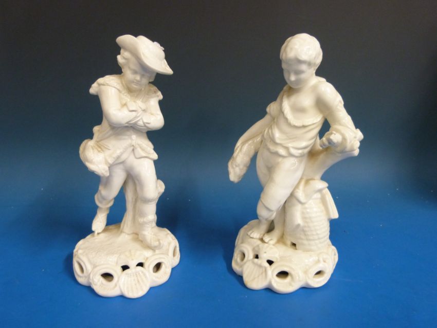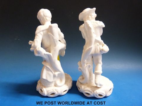A pair of late Stevenson & Hancock Derby blanc de chine figures, one a young man on skates, the other a young man with wheat sheaf, both with Paget Crown mark (22cm tall)