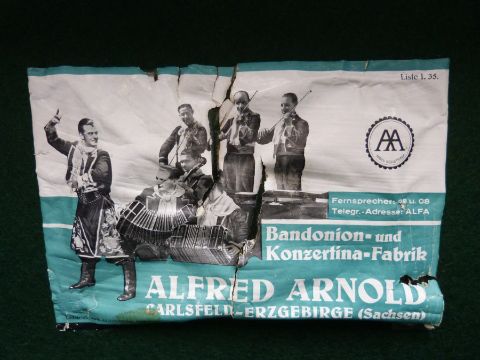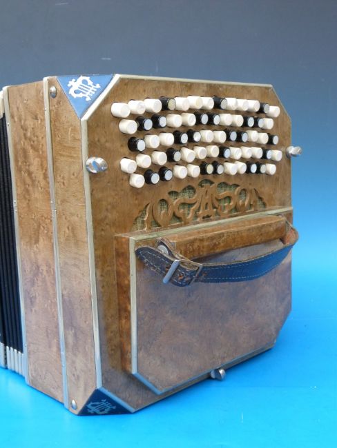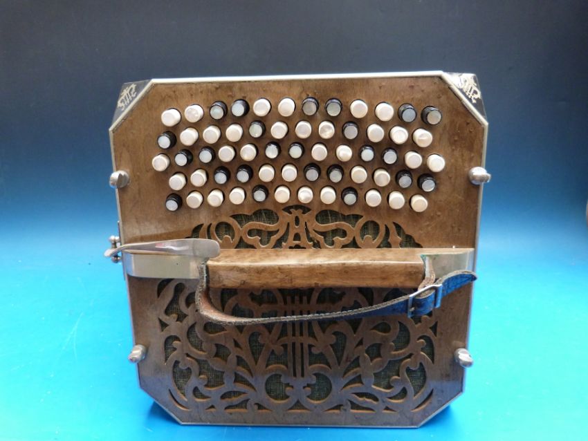 A Chromatic bandoneon by Alfred Arnold c1920, 74 treble buttons and 78 bass, with walnut finish and in original case.