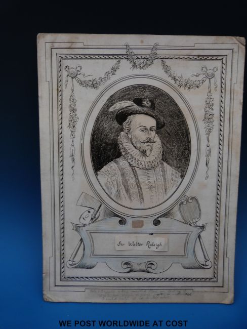 Original pen and ink drawing 'Sir Walter Raleigh' inscribed verso with details of the artwork (34 x 25cm)