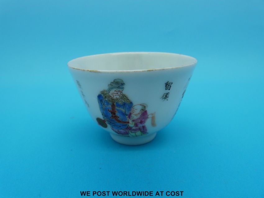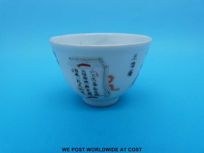 A 19thC Chinese tea bowl decorated with figures and calligraphy (6cm diameter)