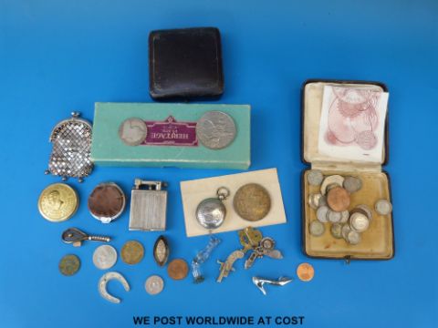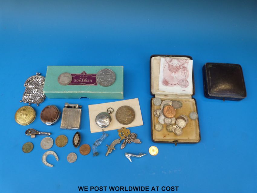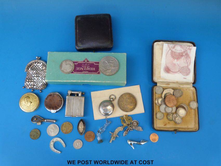 Silver sovereign holder, B/ham, seed pearl tennis racquet brooch, purse, glass pipe tamper in the form of a lady's leg, coins, cutlery and a ten shilling note