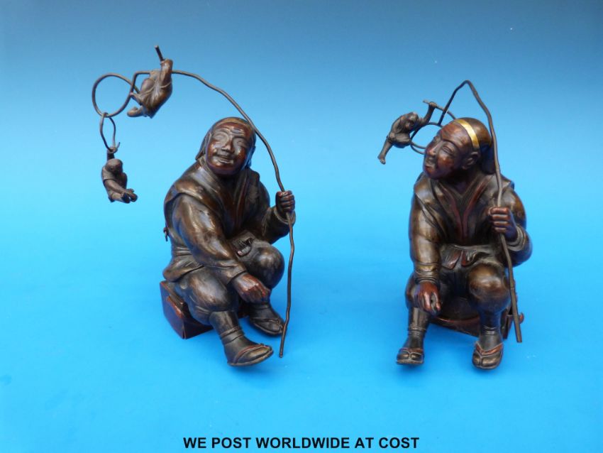 A pair of Japanese Meiji period bronze figures in the form of two Noh actors both holding sticks with swinging monkeys decorated in gilt and with snuff drawers to the bases, (15cm tall)