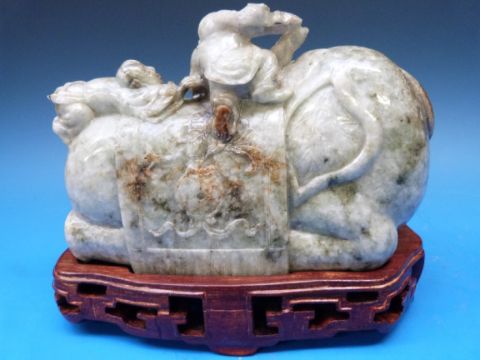 A Chinese jadeite carved model of an old man and a boy on an elephant, on pierced wooden stand (10cm, 13cm including stand)