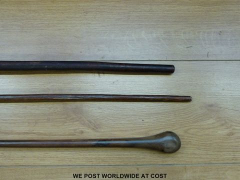 A vintage knobkerrie (75cm long) and two African spears with leather bindings, probably Zulu (103cm x 123cm)