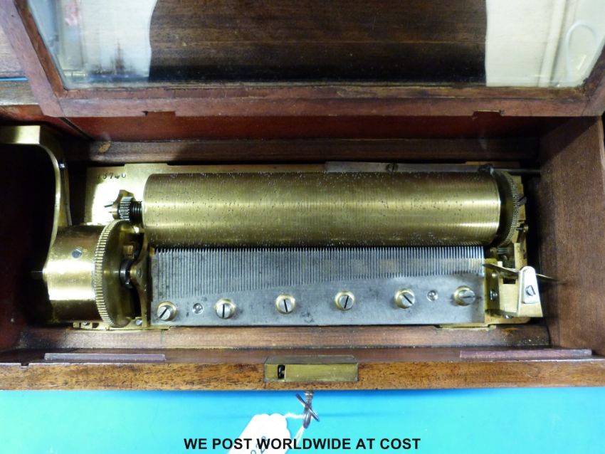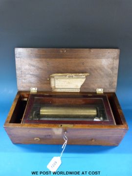 A cylinder musical box, serial number 13740 playing four airs on approximately 112 teeth comb with tune sheet. The mechanism mounted on a brass bedplate. String banding to the lid and front of case with decorative inlay to top. Case approximately L39cm x W16.5cm x H13cm