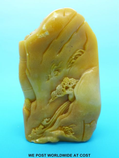 An unusual carved yellow soapstone boulder with three figures holding fruit and other items (15cm tall)
