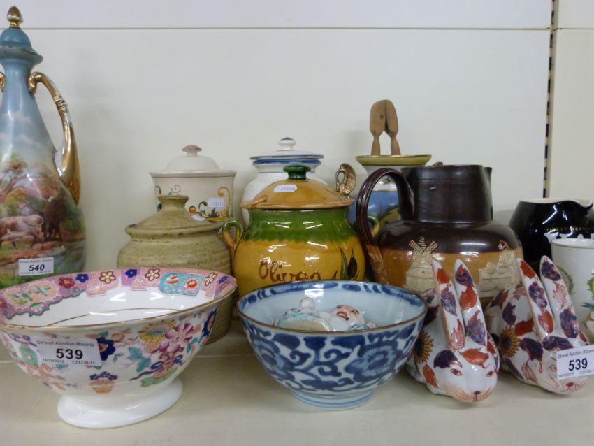 Various china items to include earthenware jars, a polychrome bowl and a blue and white bowl, a two-handled vase, a pair of red and blue decorated rabbits and a seated Buddha