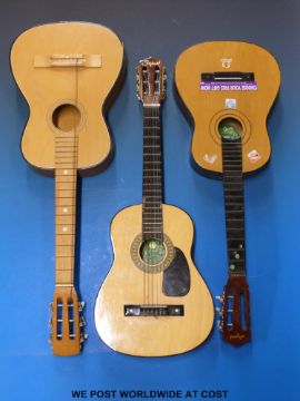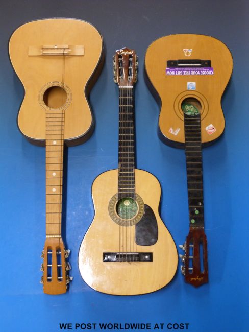 Two six-string children's size acoustic guitars by Skylark together with another example and one soft case