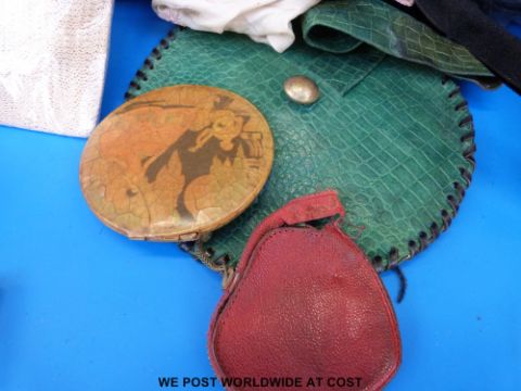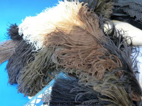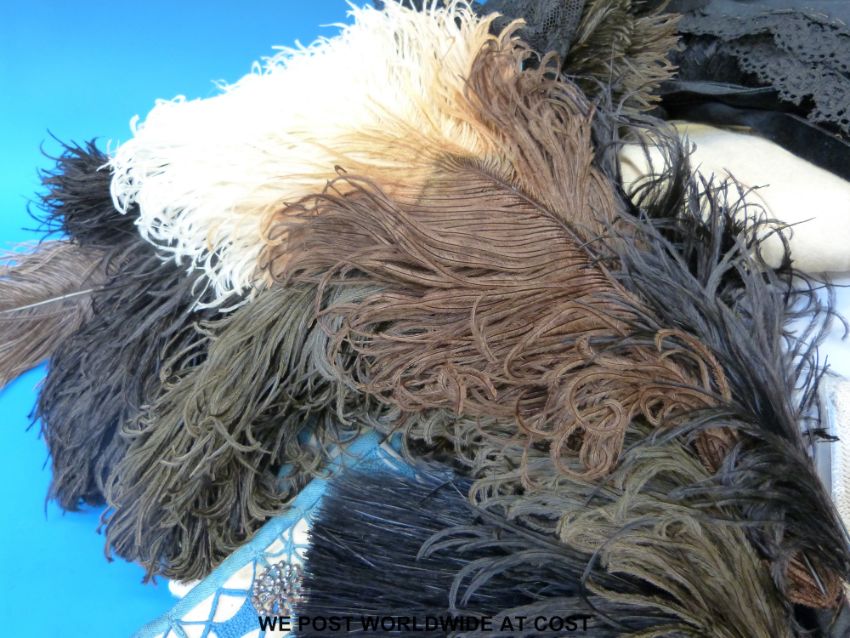 A collection of Victorian clothing, hats, feathers, clips, compact etc