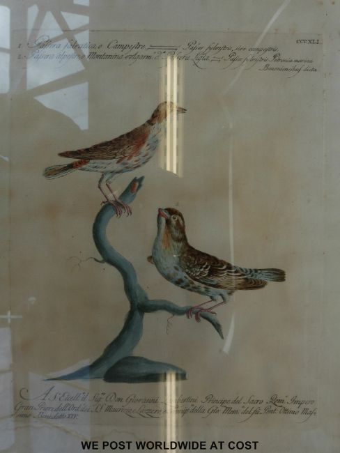 A pair of framed coloured engravings of birds (each approx 42.5cm x 33.5cm)