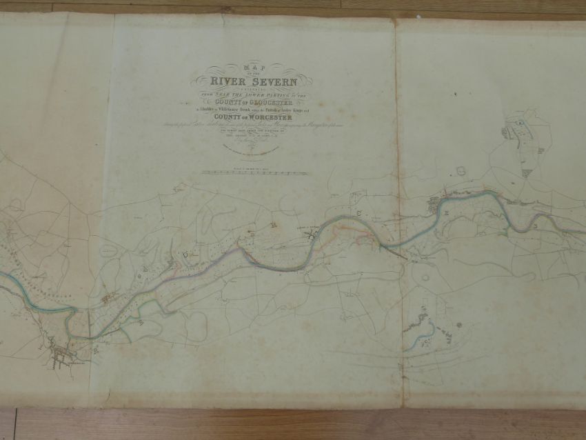 A 1837 map of the River Severn extending from near the Lower Parting in the County of Gloucester to Gladder Whitehouse Brook in the County of Worcester, showing the proposed cuts for canals and the sites of the proposed locks and views for improving the navigation of the same. The survey was made under the direction of Thos Rhodes C.E.M. Inst. C.E, drawn and engraved for the Severn Navigation Company, inscribed to rear Gloucester and Berkeley Canal Company. Also included is a copy of The Severn Navigation Bill and the Parliamentary Alleged Objections and Answers