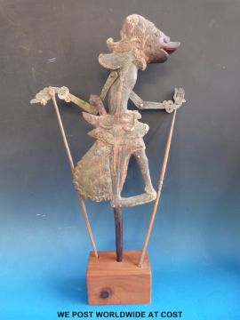 A 19thC carved wood Wayang Kulit Indonesian puppet depicting Menak Jing. Java c1830, mounted for display on wooden block (55cm tall)