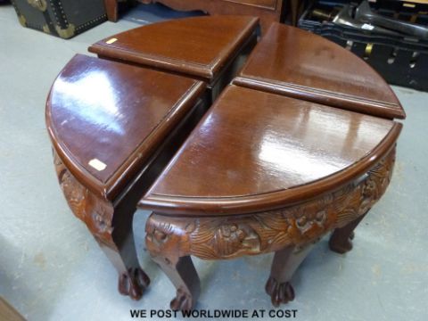 A Chinese carved dark elm glass topped round coffee table with four quarter smaller tables under. The carved centre depicts dancing figure and onlookers against a backdrop of traditional architecture and flora (h52 x w80cm) standing on four tapered legs with claw feet