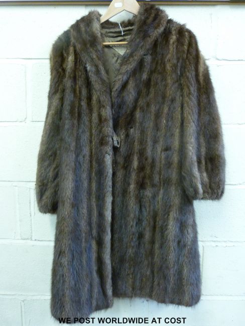 A three-quarter length, lined, vintage fur coat labelled Chas. WM Davis, Tailor and Furrier to Royalty, 56 Brook St, WI