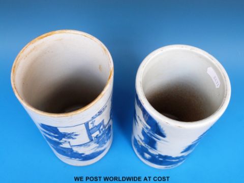Two Chinese Transitional style blue and white cylindrical vases (18cm and 19cm tall)
