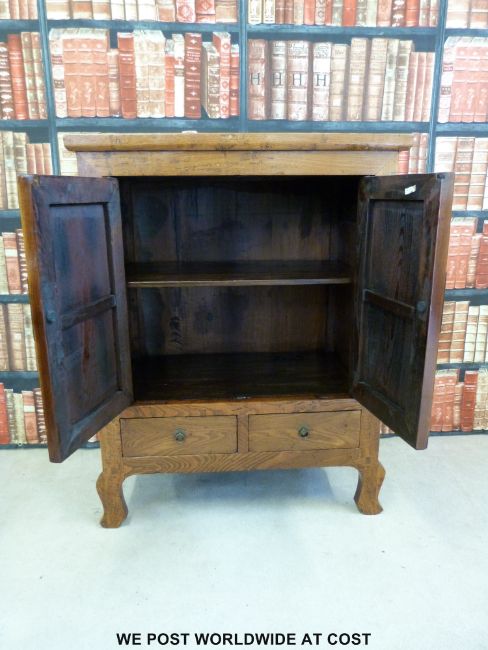 A Chinese elm two door cabinet with drawers under, raised on shaped front legs, originating from Sha'anxi Province, with original receipt and shop leaflet (118 x 93 x 53cm)