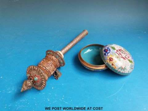 An early 20thC Chinese cloisonné circular pot (8.5cm diameter) and a Tibetan prayer wheel (24cm long)