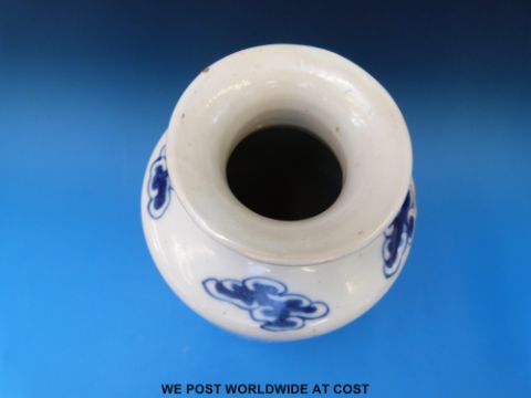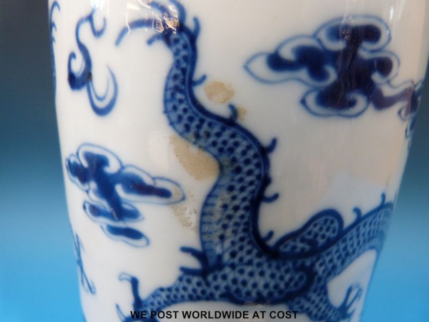 A pair of 19thC Chinese blue and white cylindrical vases with inverted rim decoration of dragon chasing flaming pearl. Four character Kangxi marks to base (26cm tall)