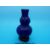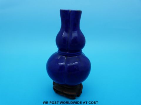 A Chinese blue monochrome double gourd vase with ribbon decoration raised on carved wooden stand (11cm tall)