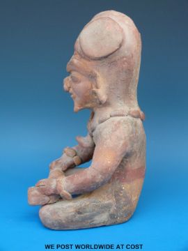 A Mayan terracotta figure in the form of a seated man wearing a necklace, 23cm tall.