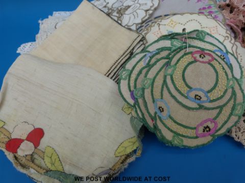 Two trays of small crochet items including Nottingham lace, mats and coasters
