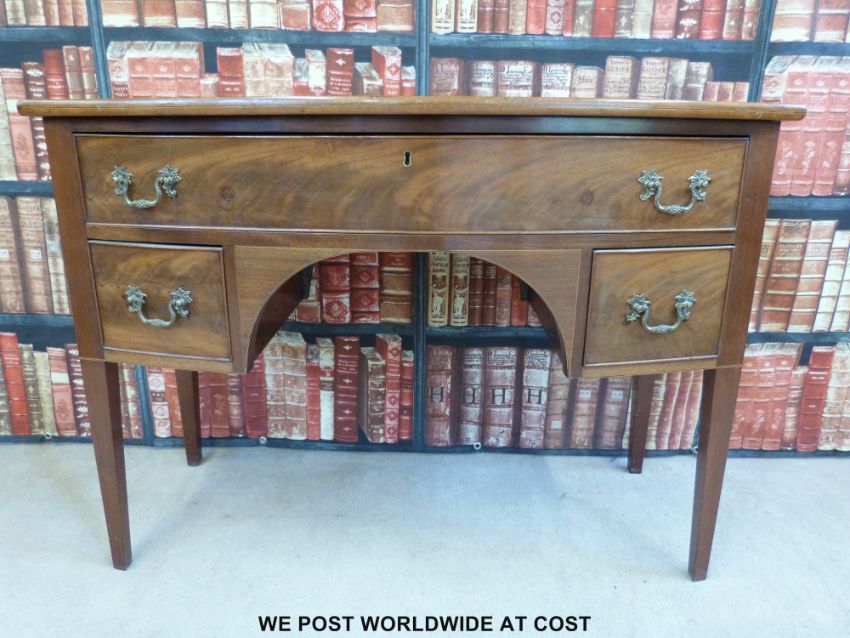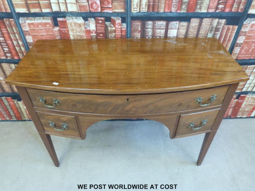 A Georgian mahogany bow front desk or side table fitted three drawers and raised on square tapering legs (w115 x d53 x h83cm)