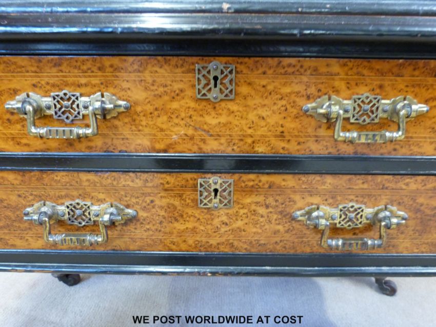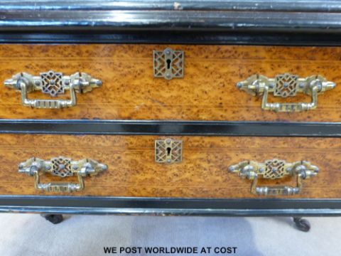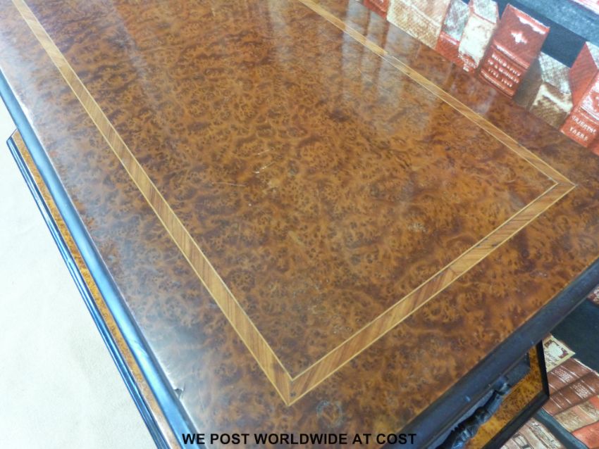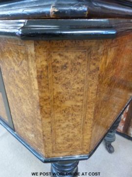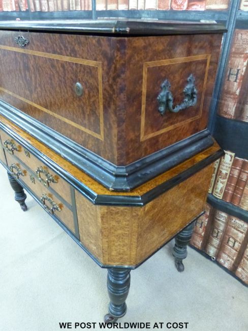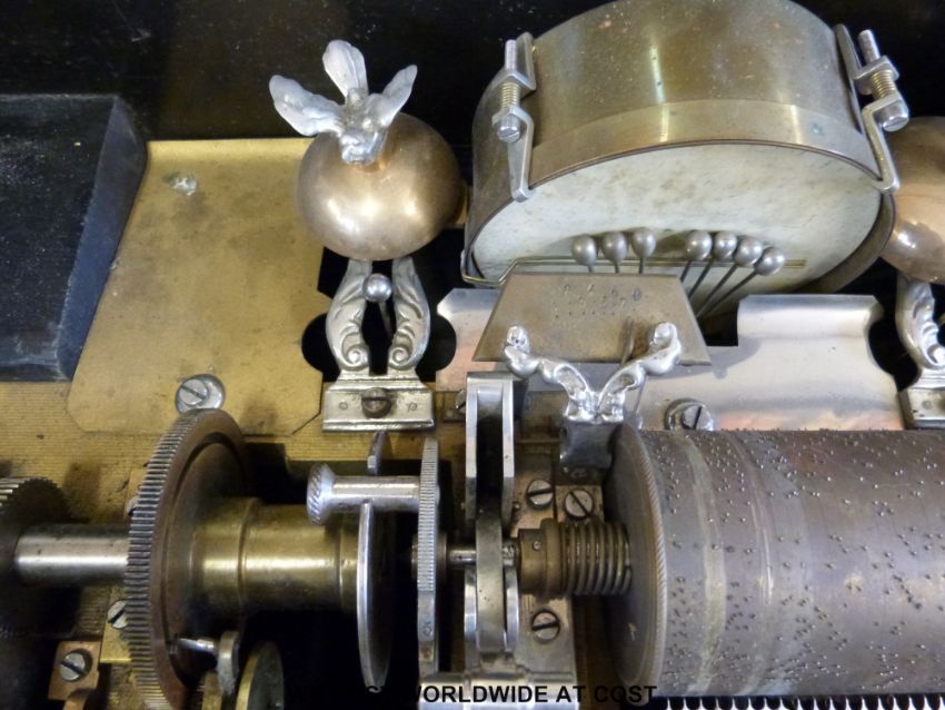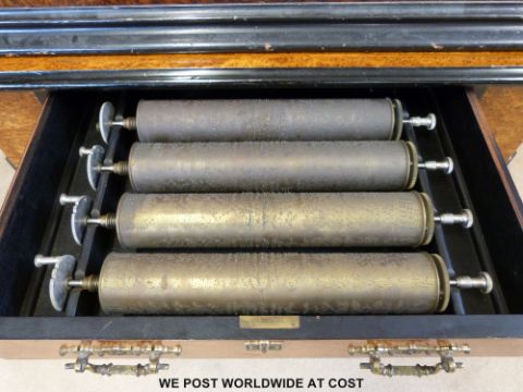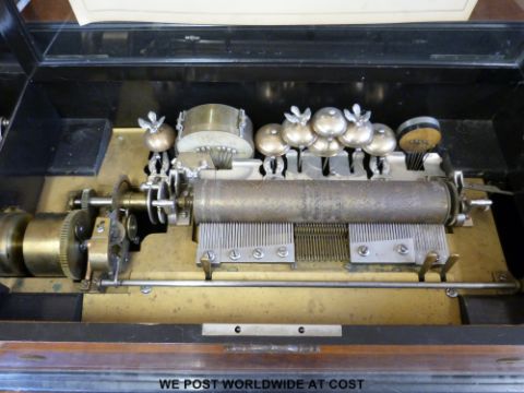 A 19thC interchangeable orchestral cylinder musical box in burr walnut case with banding to the lid and sides, mounted on a matching table with two drawers for the extra cylinders. 56 airs on seven cylinders listed on the original tune sheet, twin spring barrel with tune indicator, two combs, 18 note centre reed organ, seven bells, seven beater drum and six beater castanet. The drum, bells and castanet mechanisms can be switched off via the levers behind the comb. Stop / play and repeat controls to the side of the mechanism. Brass bed plate with nickel plated features, reeds and bellows mounted below the bedplate and driven via a crank next to the governor, three decorative bird finials to the bells. Believed to be manufactured by Samuel Troll of Geneva but the mechanism is unmarked. Cylinders 33cm long x 6.5cm diameter. Music box 92cm long x 39cm wide x 34cm tall. Table 100cm long x 53cm wide x 61cm tall