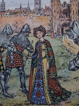 Original ink & watercolour of a medieval queen in decorative gown & cloak, in the company of three knights in front of a walled city (18 x 15cm)