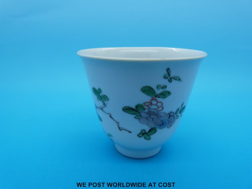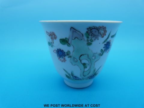 A Chinese, Kangxi period (1662-1722) famille verte flared lip tea bowl decorated with various flowers amongst rocks (7cm tall, 8cm diameter)