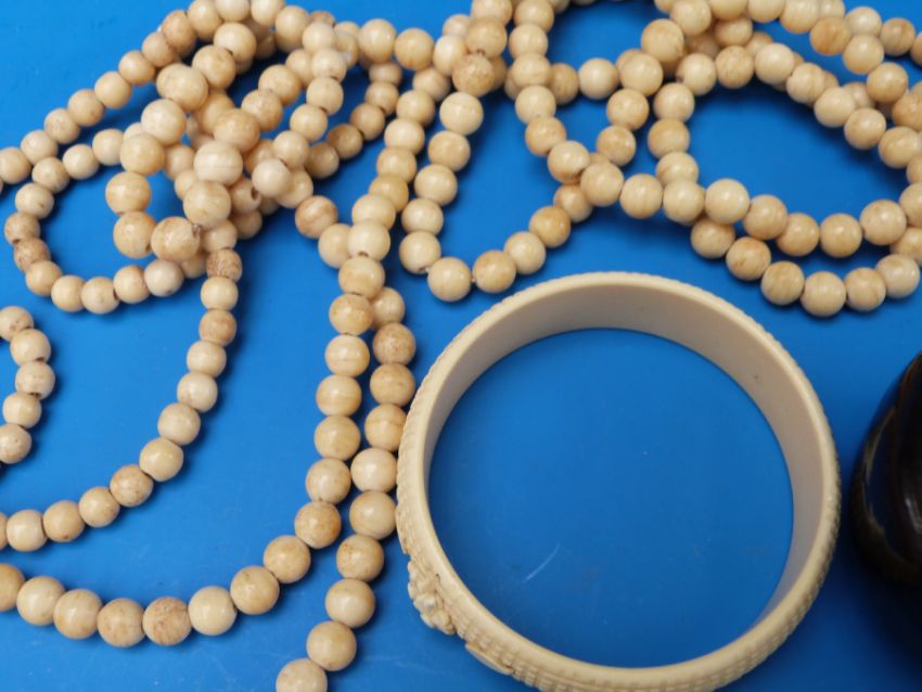 Two 19thC ivory necklaces, ivory whist/bridge marker, ivory bracelet, lacquer box